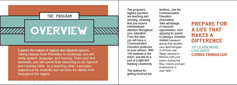 The Communication Disorders Department on Truman's campus focuses both on academic mastery as well as hands on experience. In order to compliment the overall design for the university I chose to incorporate lighter shades of the blue and the orange to create a cohesive yet distinct look. Below is a booklet of quick facts developed for the department relays important information in an easily legible format with the incorporation of infographics. The setup of this booklet enables it to act as either a piece of literature sent in the mail or a handout given to prospective students on visit day.